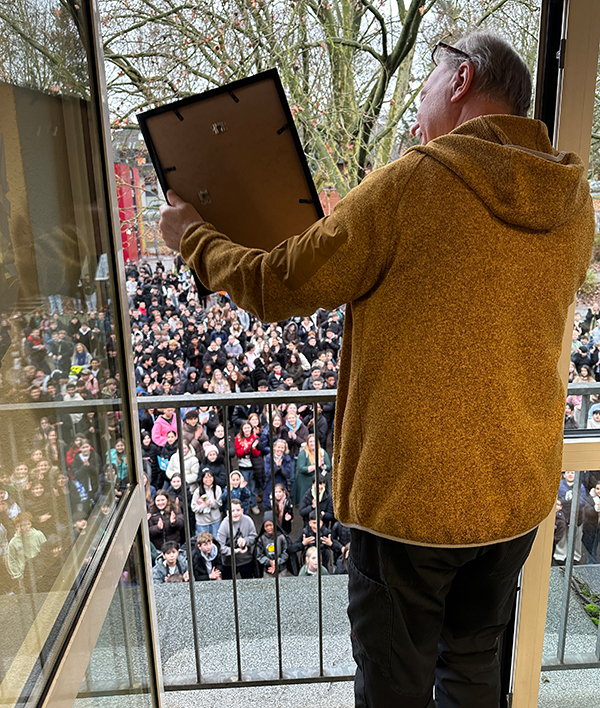 Die gesamte Schulgemeinde dankt Herrn Bonny für die geleisteten Dienste. Zum Abschied kamen alle Schülerinnen und Schüler zusammen und es gab zum Schluss einen donnernden Applaus. Schulleiter Daniel Wuttke bedankte sich ebenfalls herzlich im Namen des Kollegiums. Wir alle wünschen Herrn Bonny alles Gute für den wohlverdienten Ruhestand.