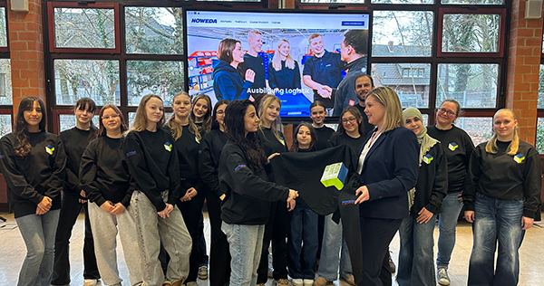 Kontakte mit Noweda bestehen schon länger, da die Firma die Realschule im Bereich der Berufsorientierung unterstützt, zum Beispiel mit Projekten wie "Azubi trifft Schülerin/Schüler" oder "Schülerin/Schüler trifft Chefin/Chef". Auch beim Bewerbungstraining steht Noweda hilfreich zur Seite. "Wir bieten Ausbildungen in den Bereich Fachlagerist/in, Fachkraft für Lagerlogistik und für angehende Groß- und Außenhandelskaufleute an. Wer sich bewerben möchte, kann sich auf der Webseite noveda.de über Angebote informieren", erläuterte Frau Wolf, die die Shirts an die Medienscouts übergab. Worüber sich diese sichtlich sehr freuten.